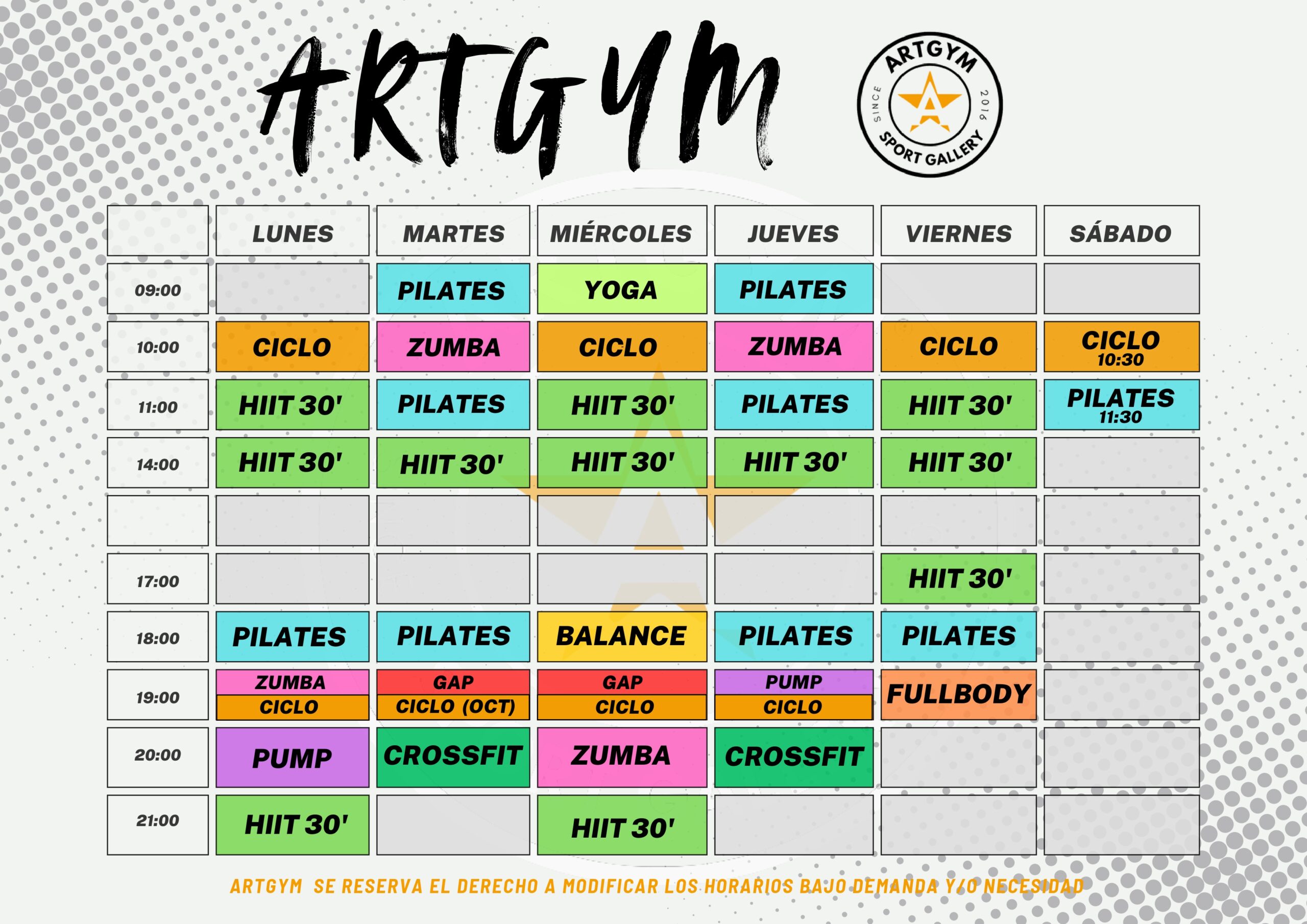 | 9:00 - 10:00 | PILATES (COLECTIVA) | GAP (COLECTIVA) | PILATES (COLECTIVA) | PUM (COLECA) | YOGA (COLECTIVA) | ||